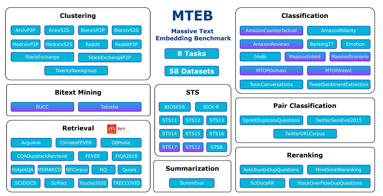 MTEB는 임베딩 모델을 다양한 작업에 대해 테스트합니다.