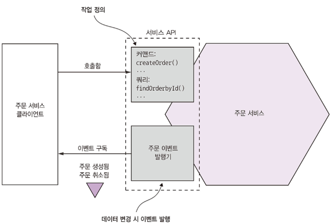 서비스는 어떤 기능이 구현되어 단독 배포가 가능한 소프트웨어 컴포넌트이다. 클라이언트가 자신이 서비스하는 기능(functionality)에 접근할 수 있도록 커맨드, 쿼리, 이벤트(event)로 구성된 API를 제공한다. 서비스 API는 내부 구현 상세를 캡슐화하는데 모놀리스와 달리 개발자는 API를 우회하여 서비스에 접근하는 코드를 작성할 수 없으므로 마이크로서비스 아키텍처에서 애플리케이션 모듈성은 보장된다.