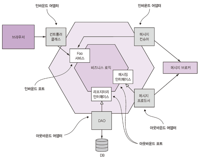 인바운드 포트는 비즈니스 로직이 표출된 API이며, 아웃바운드 포트는 비즈니스 로직이 외부 시스템을 호출하는 방법이다. 이렇게 분리를 하면 비즈니스 로직만 따로 테스트하기도 쉽고, 현대 애플리케이션 아키텍처를 좀 더 정확하게 반영할 수 있다. 육각형 아키텍처는 마이크로서비스 아키텍처를 이루는 각 서비스 아키텍처를 기술하는 가장 좋은 방법이다.