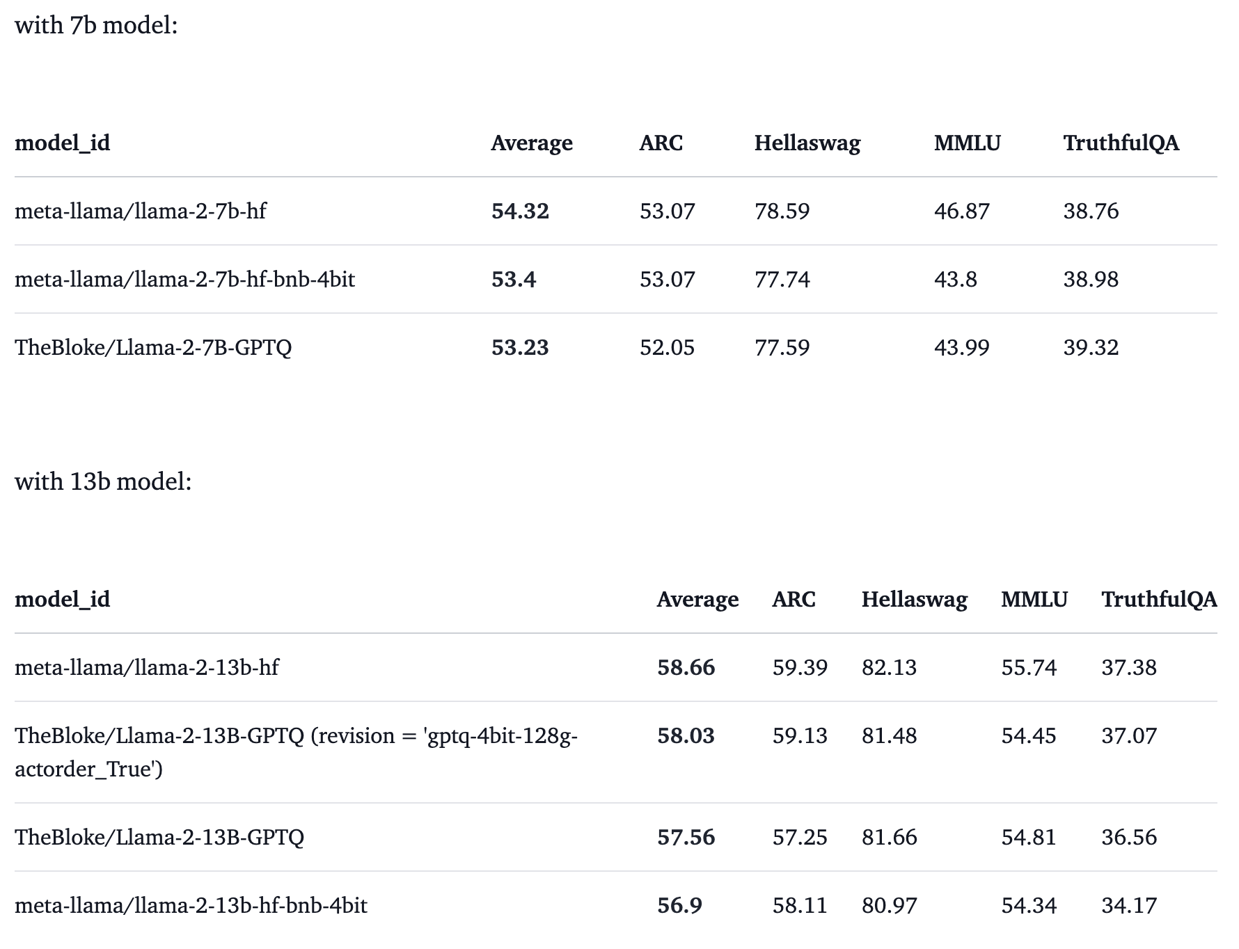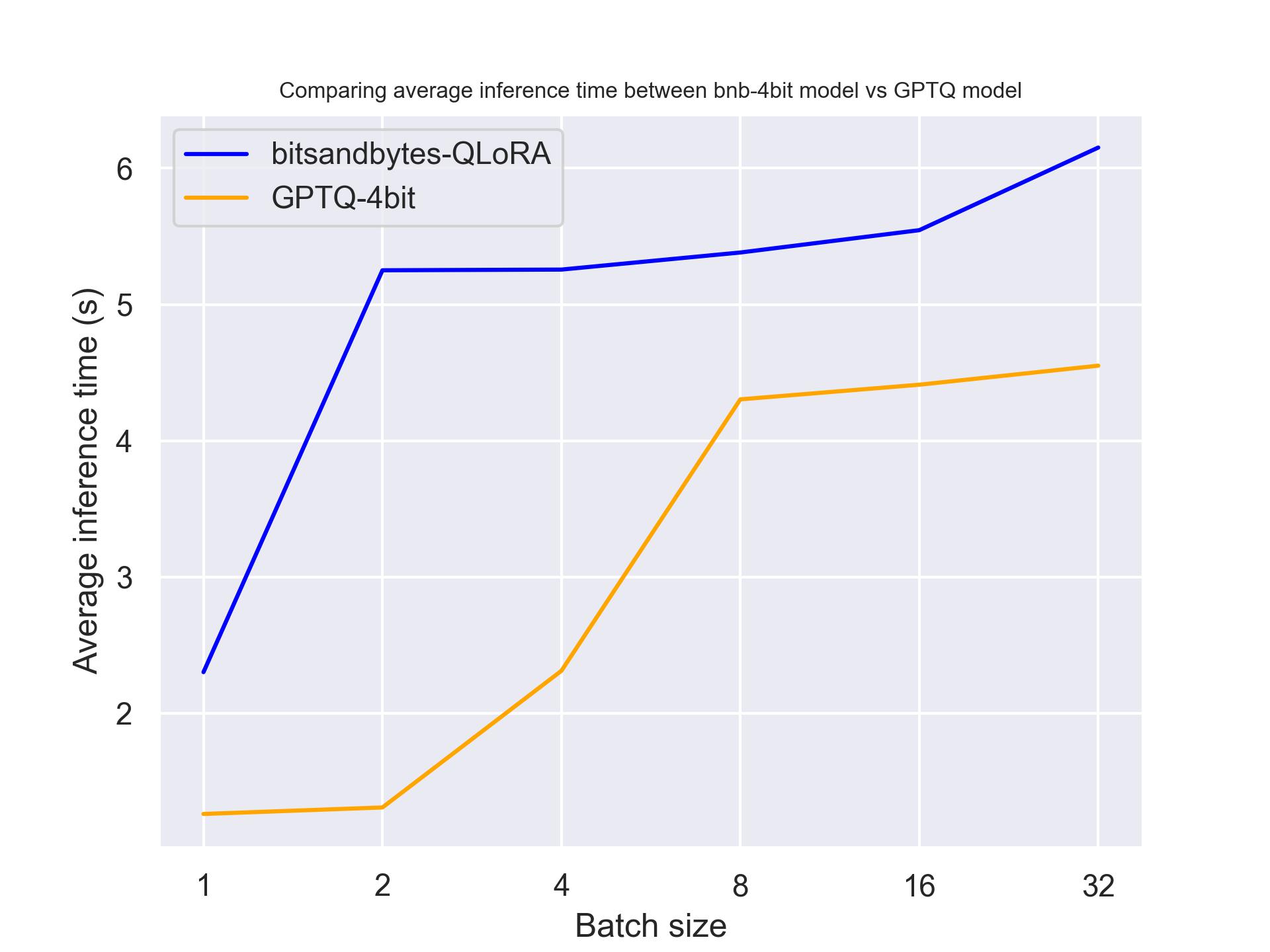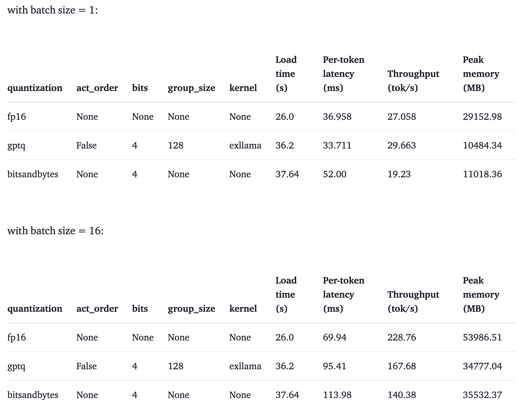 벤치마크를 통해 알 수 있었던 결과는 bitsandbytes와 GPTQ가 동일한 성능을 보이며, 대규모 배치 크기에서는 GPTQ가 약간 더 빠르다는 것입니다.