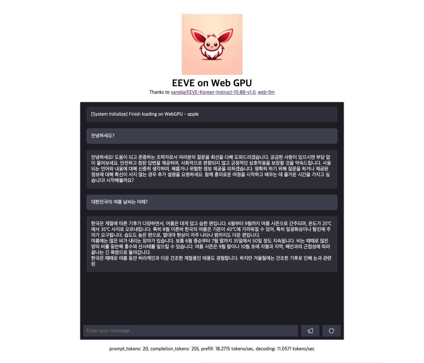 이번 포스트는 한국어 오픈소스 모델인 EEVE 모델을 Web GPU로 서빙하는 것을 실습하는 위주로 작성할 예정입니다.