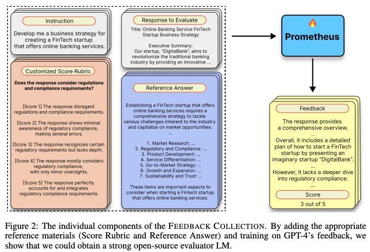 PROMETHEUS는 주어진 참고 자료(참고 답변, 평가 기준표)를 바탕으로 GPT-4와 유사한 평가 능력을 발휘할 수 있는 오픈소스 LLM으로 개발되었으며, 이를 통해 연구자들이 보다 투명하고 비용 효율적인 방식으로 텍스트 생성 모델을 평가할 수 있게 됩니다.