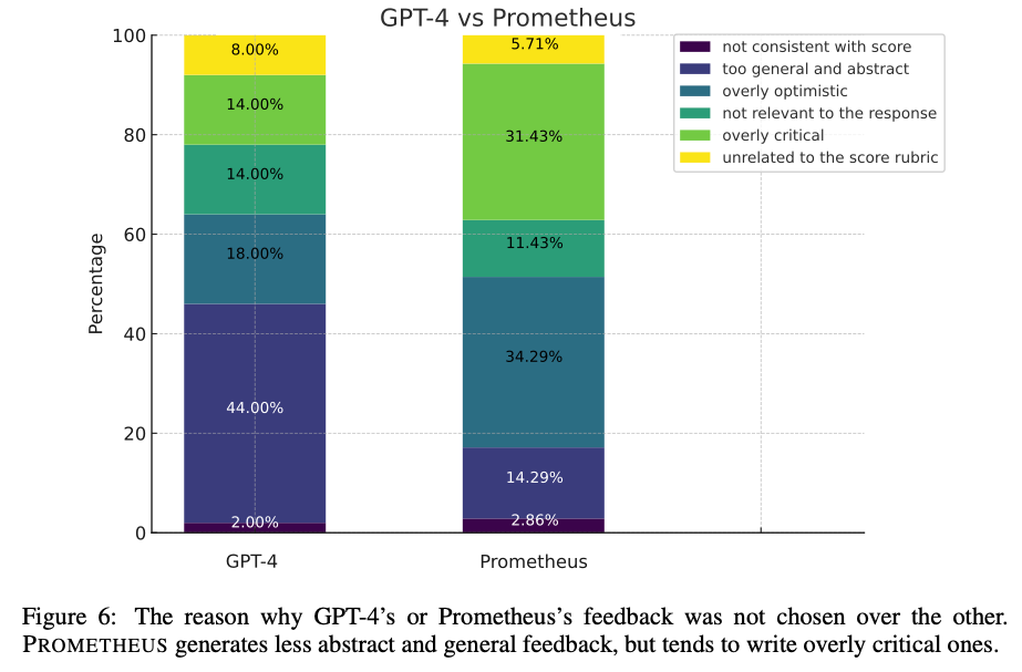 피드백 품질의 Pairwise Comparison 외에도, 인간 평가자에게 피드백을 선호하는 이유를 6가지 포괄적인 옵션 중 최소 하나를 선택하여 분석하도록 했습니다. GPT-4는 주로 일반적이거나 추상적인 피드백을 제공했기 때문에 선택되지 않은 반면, PROMETHEUS는 주로 주어진 응답에 대해 지나치게 비판적이어서 선택되지 않았습니다. 이 결과를 바탕으로 GPT-4가 보다 중립적이고 추상적인 경향을 보이는 반면, PROMETHEUS는 주어진 응답이 좋은지 여부에 대한 의견을 명확하게 표현하는 경향이 있음을 알 수 있습니다. 이는 PROMETHEUS를 오직 세밀한 평가만 수행하도록 직접적으로 fine-tuning한 결과로, 본질적으로 이를 생성자가 아닌 평가자로 변환시킨 것이라고 추측합니다.