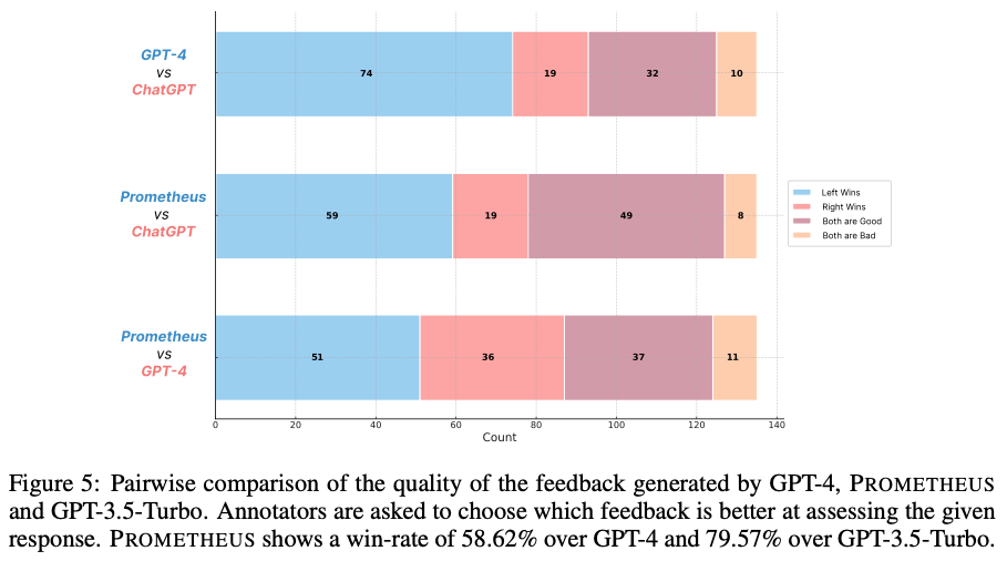 PROMETHEUS가 점수 결정 외에도 유용하고 의미 있는 피드백을 생성하는지를 확인하기 위해, human annotators에게 더 나은 피드백을 선택하도록 요청했습니다. PROMETHEUS가 GPT-4보다 58.62%의 비율로, GPT-3.5-Turbo보다 79.57%의 비율로 선호되었음을 보여줍니다. 이는 PROMETHEUS의 피드백이 또한 의미 있고 유용하다는 것을 나타냅니다.
