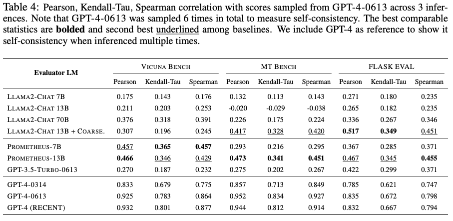 - FEEDBACK BENCH 결과: 우리의 모델은 이 데이터에 대해 직접 fine-tuning되었기 때문에, 잘 훈련된 경우 유사한 분포의 테스트 세트에서 GPT-4를 능가하는 것은 자연스러운 일입니다. 또한, GPT-4의 경우 지시문에 대한 추론 결과와 새로운 인스턴스를 증강하여 비교했기 때문에 자체 일관성이 낮아질 수 있습니다.