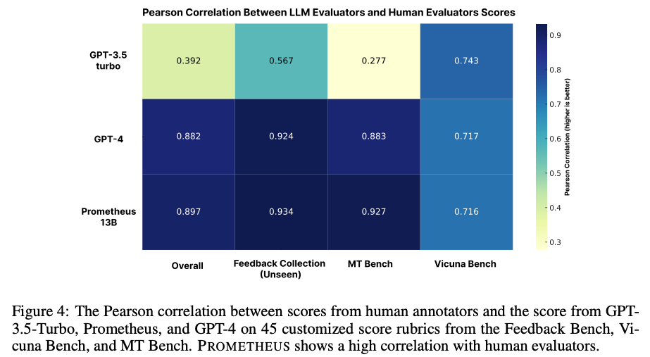 FEEDBACK BENCH(Unseen Score Rubric subset), MT Bench(Zheng et al., 2023), Vicuna Bench(Chiang et al., 2023)라는 세 가지 평가 데이터셋에서 각각 45개의 고유한 맞춤형 점수 기준표를 사용하여 human annotators와 모델 간의 상관관계를 비교했습니다. PROMETHEUS가 세 가지 평가 데이터셋 모두에서 GPT-4와 동등한 수준임을 보여줍니다. PROMETHEUS는 Pearson 상관계수 0.897을 얻었고, GPT-4는 0.882, GPT-3.5-Turbo는 0.392를 얻었습니다.
