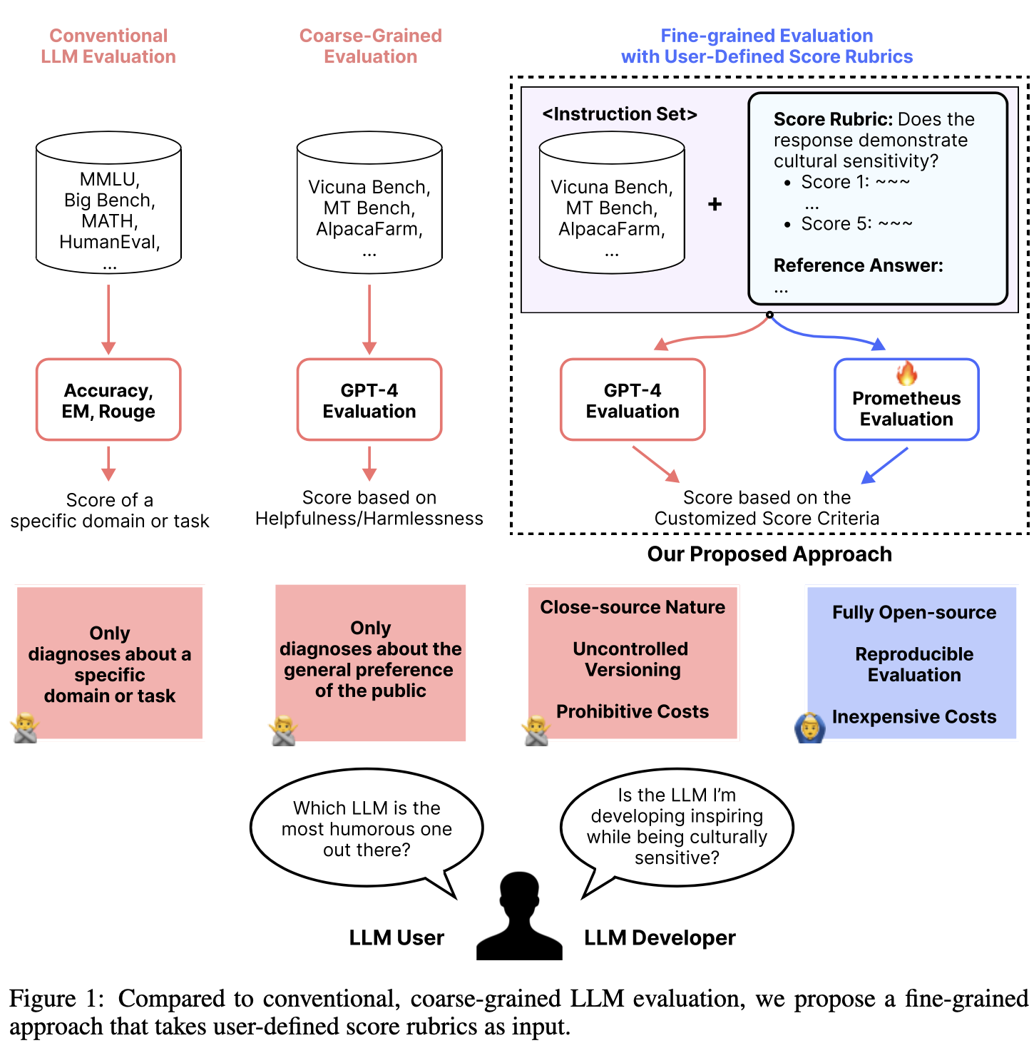 따라서 이 논문은 GPT-4와 같은 폐쇄된 상업적 모델이 아닌, 오픈소스 기반의 LLM을 통해 맞춤형 평가 기준을 적용할 수 있는 PROMETHEUS라는 모델을 제안하고 있습니다. 이 모델은 다양한 평가 기준을 수용할 수 있도록 설계되었으며, 인간 평가자와 비슷한 수준의 평가 능력을 갖추고 있습니다.