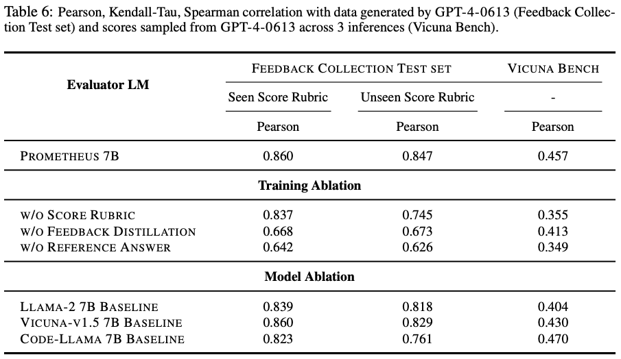 훈련 Ablation: 결과는 각 구성 요소가 PROMETHEUS의 우수한 평가 성능에 독립적으로 기여한다는 것을 나타냅니다. 특히, 참조 답변을 제외하는 것이 성능 저하에 가장 큰 영향을 미치며, 이는 참조 답변을 포함하는 것이 평가자 LLM이 지시문을 내부적으로 해결할 필요를 없애고 응답 평가에만 집중할 수 있게 한다는 우리의 주장을 뒷받침합니다. 또한, FEEDBACK BENCH에서 score rubric을 제외해도 성능이 크게 저하되지 않지만, Vicuna Bench에서 평가할 때는 성능이 크게 떨어집니다. 우리의 가설처럼, 다른 데이터셋에서 일반화하기 위해서는 무엇을 평가해야 하는지를 제공하는 역할이 상대적으로 중요하다고 추정합니다.