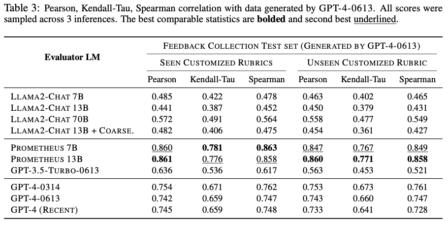 Table 3에서 LLAMA-2-CHAT 13B의 성능은 7B 모델보다 감소했으며, 70B 크기로 확장되었을 때 약간의 성능 향상을 보였지만, 단순히 모델 크기를 늘리는 것이 LLM의 평가 능력을 반드시 향상시키는 것은 아님을 보여줍니다. 반면, PROMETHEUS 13B는 Pearson 상관관계에서 본 모델인 LLAMA2-CHAT 13B보다 Seen rubric 세트에서 +0.420, Unseen rubric 세트에서 +0.397의 향상을 보였습니다. 또한, PROMETHEUS는 LLAMA2-CHAT 70B, GPT-3.5-TURBO-0613, 그리고 다양한 버전의 GPT-4를 능가하는 성과를 보였습니다. PROMETHEUS의 높은 성능은 테스트 세트 내의 instructions 및 responses가 우리가 사용한 훈련 세트와 유사한 분포를 공유할 수 있기 때문이라고 추정됩니다(LLM과 상호작용하는 시나리오를 시뮬레이션하는 경우), 비록 score rubric이 보이지 않는 경우에도 말입니다. 또한, coarse-grained score rubric에서 도출된 피드백으로 훈련한 LLAMA2-CHAT 13B + COARSE의 성능 향상은 미미했으며, 이는 다양한 score rubric에서 훈련하는 것이 맞춤형 rubric을 처리하는 데 중요함을 나타냅니다.