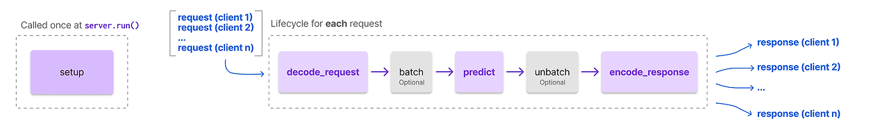 - batch: 여러 요청을 어떻게 그룹화할지 정의할 수 있습니다. 지정하지 않으면, LitServe가 자동으로 이를 처리하는 휴리스틱(heuristics)을 사용합니다.